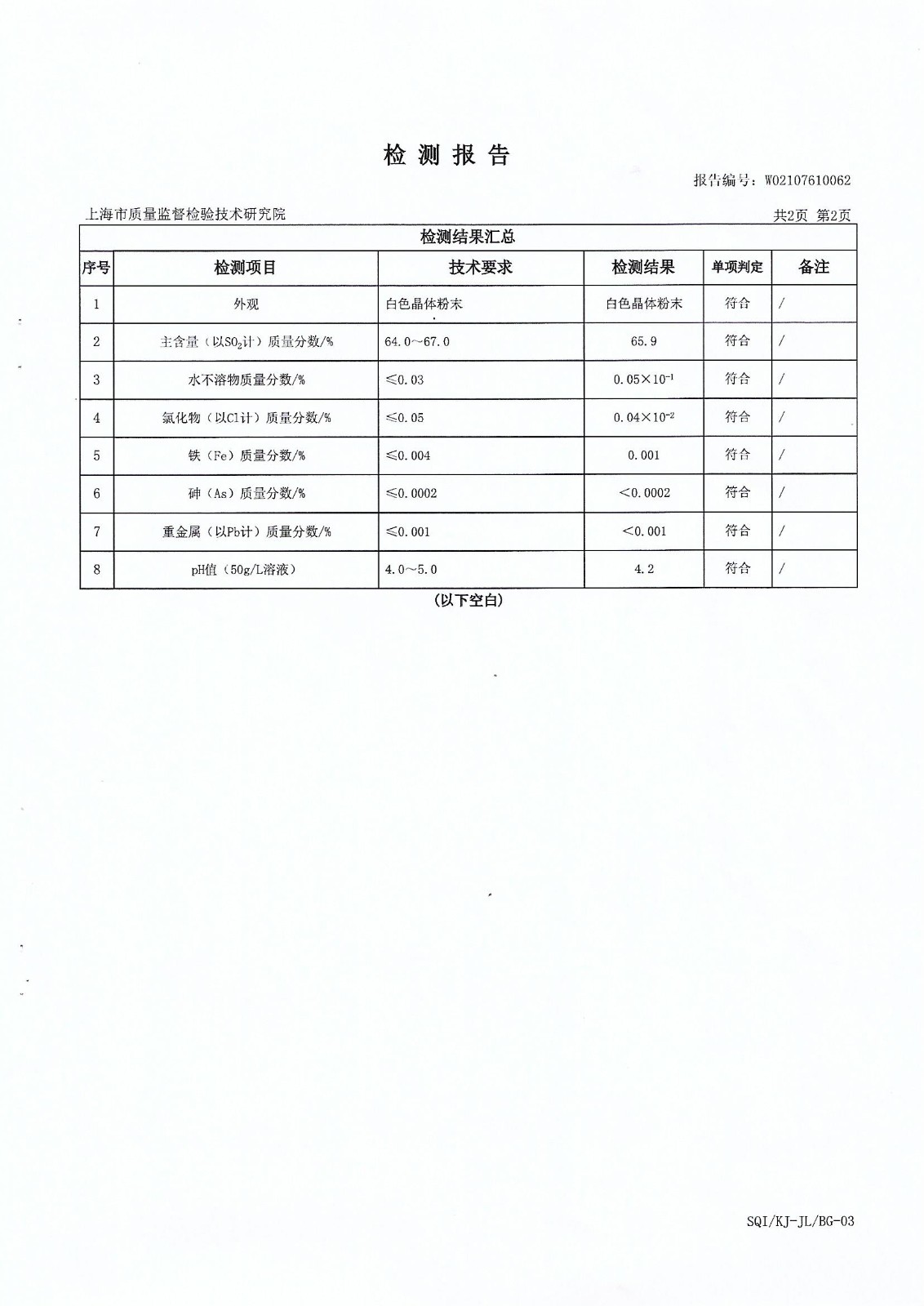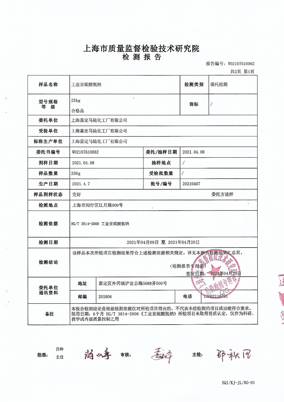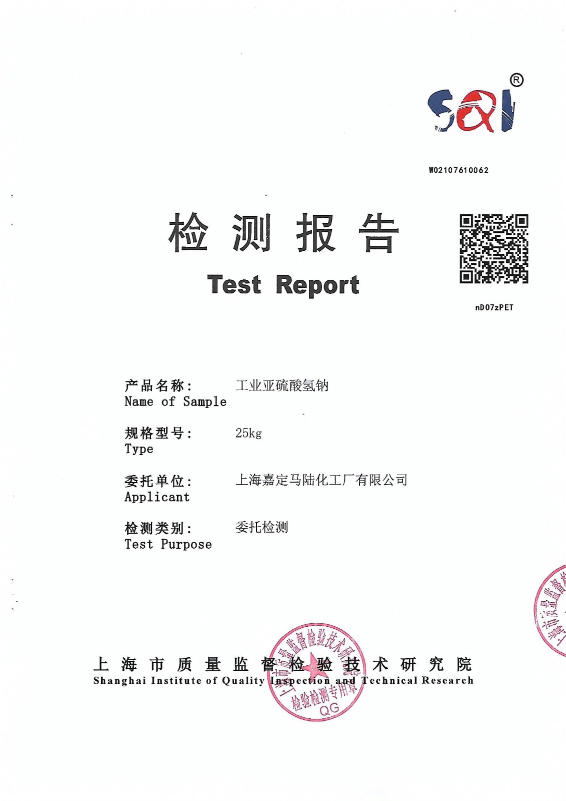工業亞硫酸氫鈉25公斤檢測報告